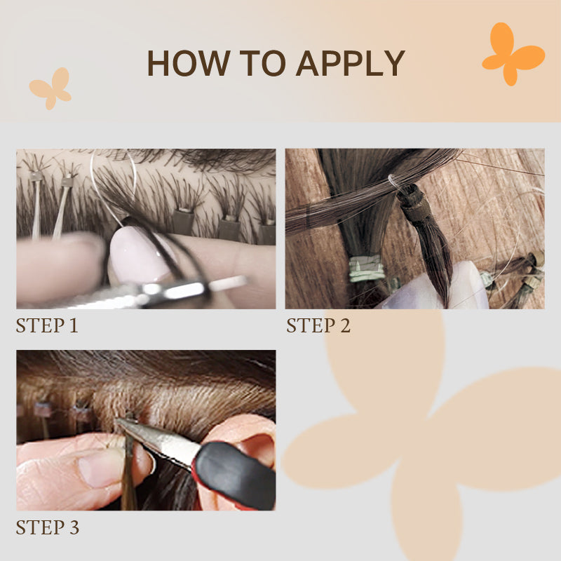 Micro beads or rings, no glue or heat required. | Heat-melt keratin glue with heating tools. | Micro rings, no glue or heat required. |