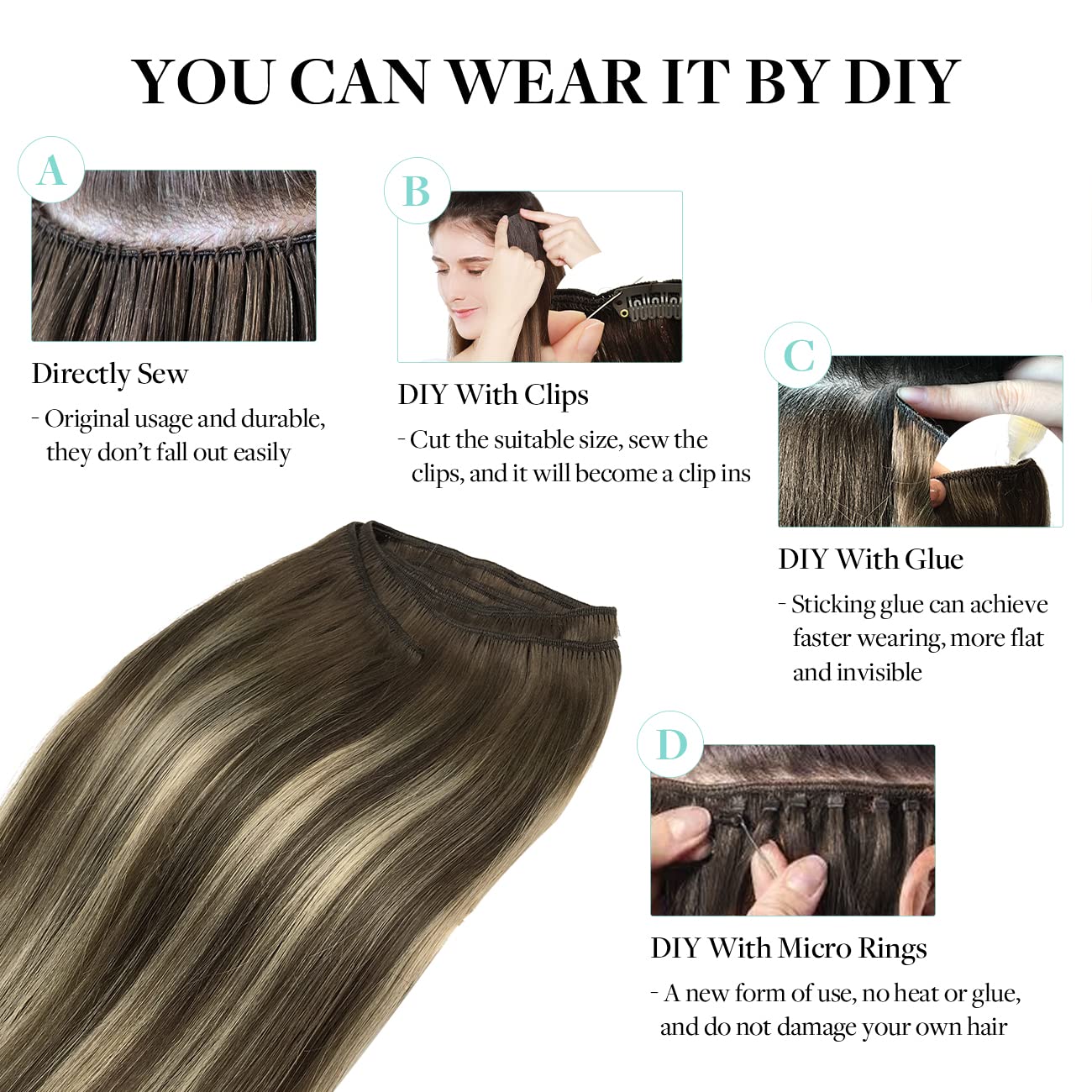 Step 4: Installation Methods There are two primary methods for installing weft hair extensions: sew-in and tape-in. Choose the method that suits your preferences and follow the corresponding steps below.